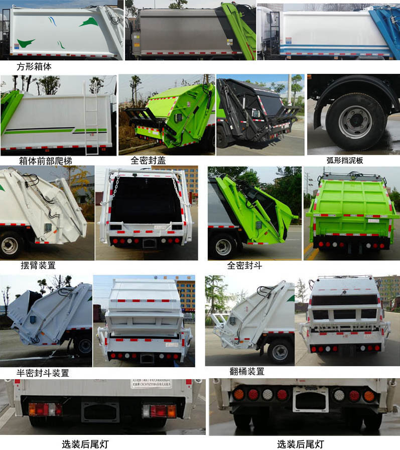 1、該車主要專用裝置由箱體、壓縮系統(tǒng)組成,用于垃圾的收集與清運(yùn)。該車可選裝方形或弧形箱體,選裝全密封蓋裝置,選裝弧形擋泥板,選裝箱體前部爬梯,選裝后部工作裝置。選裝工作裝置時(shí),外形長(mm)/后伸(mm)/整備質(zhì)量(kg)對(duì)應(yīng)關(guān)系:①無上料裝置: 6465/-/5280;②擺臂裝置: 6625/160/5600;③全密封斗裝置: 6665/200/5600;④翻桶裝置,半密封斗裝置: 6865/400/5600。2、側(cè)防護(hù)采用冷彎型鋼/Q235,螺栓連接;后防護(hù)由專用裝置替代,下邊緣離地高500mm。3、隨底盤選裝一種僅變化前面板、前格柵、前組合燈具的駕駛室;選裝后視鏡款式;選裝前部標(biāo)牌“4K ENGING/NJR/NHR/NKR/100P”。ABS型號(hào)/生產(chǎn)企業(yè)對(duì)應(yīng)關(guān)系為:APG3550500A/浙江亞太機(jī)電股份有限公司,CM4YL/廣州瑞立科密汽車電子股份有限公司;CM4XL-4S/4M/廣州瑞立科密汽車電子股份有限公司;4、發(fā)動(dòng)機(jī)4KH1CN6LB的油耗值為15.9L/100Km。 |